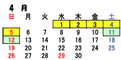 | 4月1日(水)〜5日(日) | 11日(土)〜12日(日) | |
