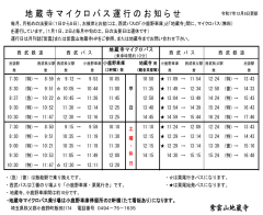 ◎毎月1日〜5日の法要日、またお盆・お彼岸は、西武バス「小鹿野車庫」2軒隣から地蔵寺間に、無料のマイクロバスを運行していますのでご利用下さい。ただし、1月1日と2日はマイクロバスが運休となりますので、ご了承下さい。月半ばの法要日は、バスの運行はございませんのでご注意下さい。 |
